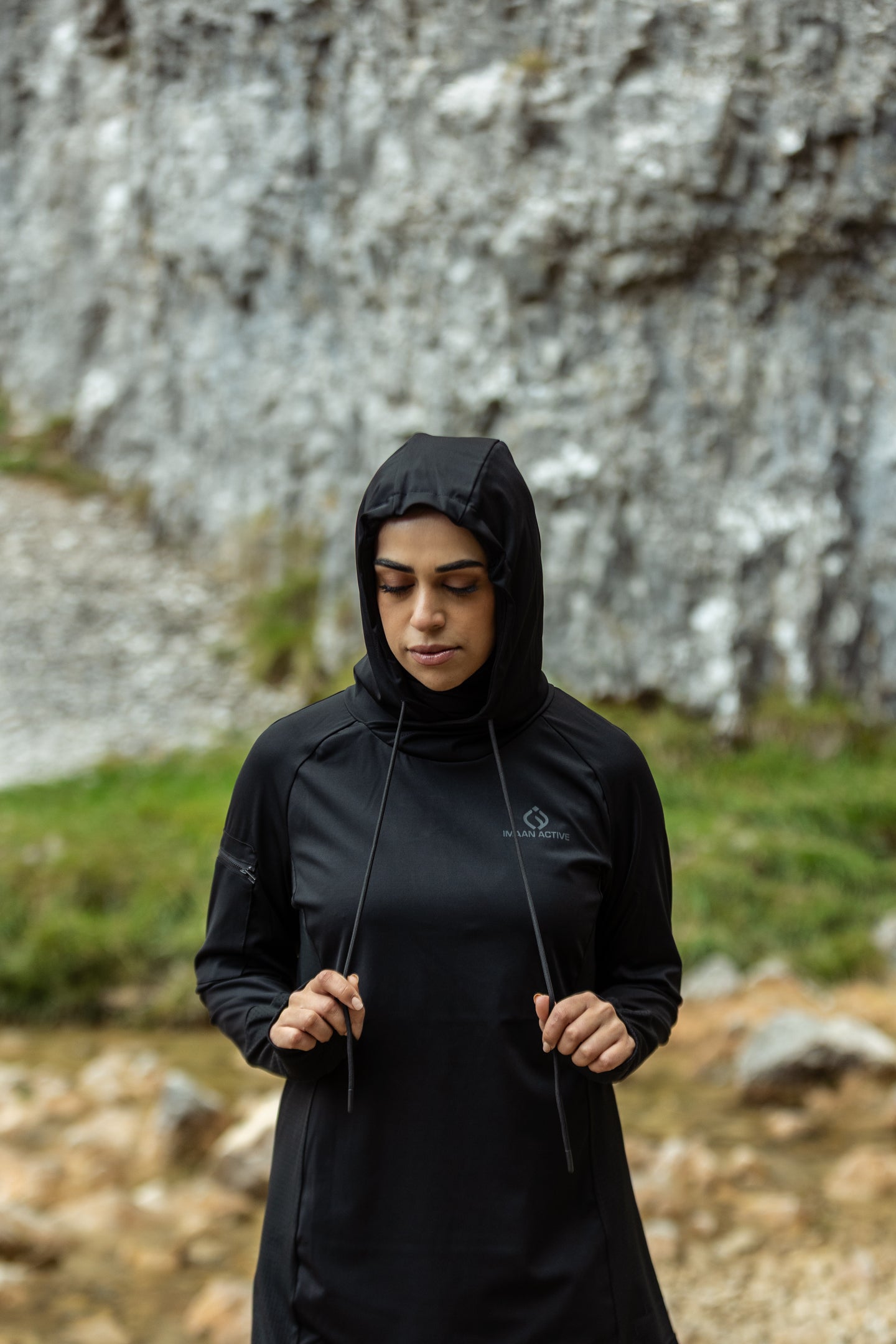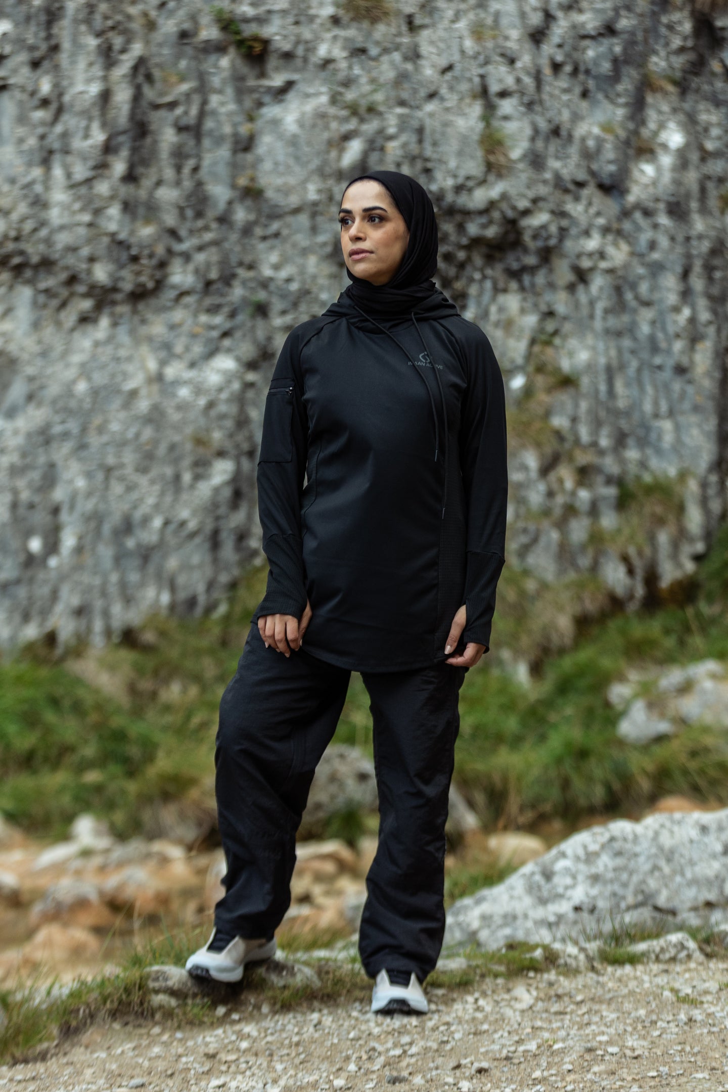 Functional details make it perfect for active days — a discreet arm zip pocket keeps your essentials secure, thumbholes keep sleeves in place while adding extra coverage, and the adjustable hood offers protection when the weather turns. With a modest, relaxed fit, it’s designed to move with you while giving you confidence in every stride.